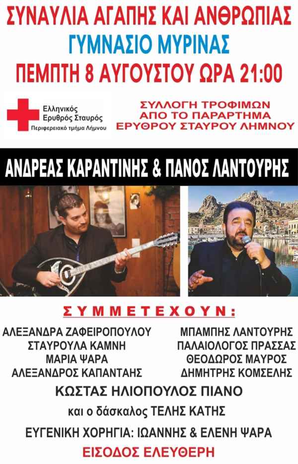 Για ακόμη μία χρονιά, η «Συναυλία Αγάπης και Ανθρωπιάς» έρχεται να γεμίσει τις καρδιές μας με μελωδίες και μηνύματα αλληλεγγύης. Την Πέμπτη 8 Αυγούστου, στο Γυμνάσιο Μύρινας, στις 21:00, 12 εκλεκτοί μουσικοί και τραγουδιστές ενώνουν τις δυνάμεις τους για να προσφέρουν μία βραδιά γεμάτη μουσική, με μοναδικό σκοπό να στηρίξουν το Κοινωνικό Παντοπωλείο του Π.Τ. Λήμνου-Αγίου Ευστρατίου του Ελληνικού Ερυθρού Σταυρού.