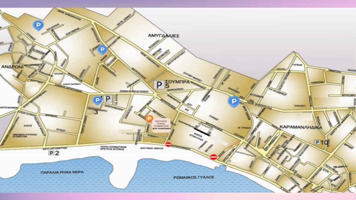 Για την καλύτερη εξυπηρέτησή τους, οι οδηγοί έχουν τη δυνατότητα να σταθμεύουν τα οχήματά τους δωρεάν στους δημοτικούς χώρους στάθμευσης οι οποίοι έχουν σημειωθεί στο σχεδιάγραμμα με μπλε σήμα. Με πορτοκαλί σήμα είναι ιδιωτικός χώρος στάθμευσης (επί πληρωμή).