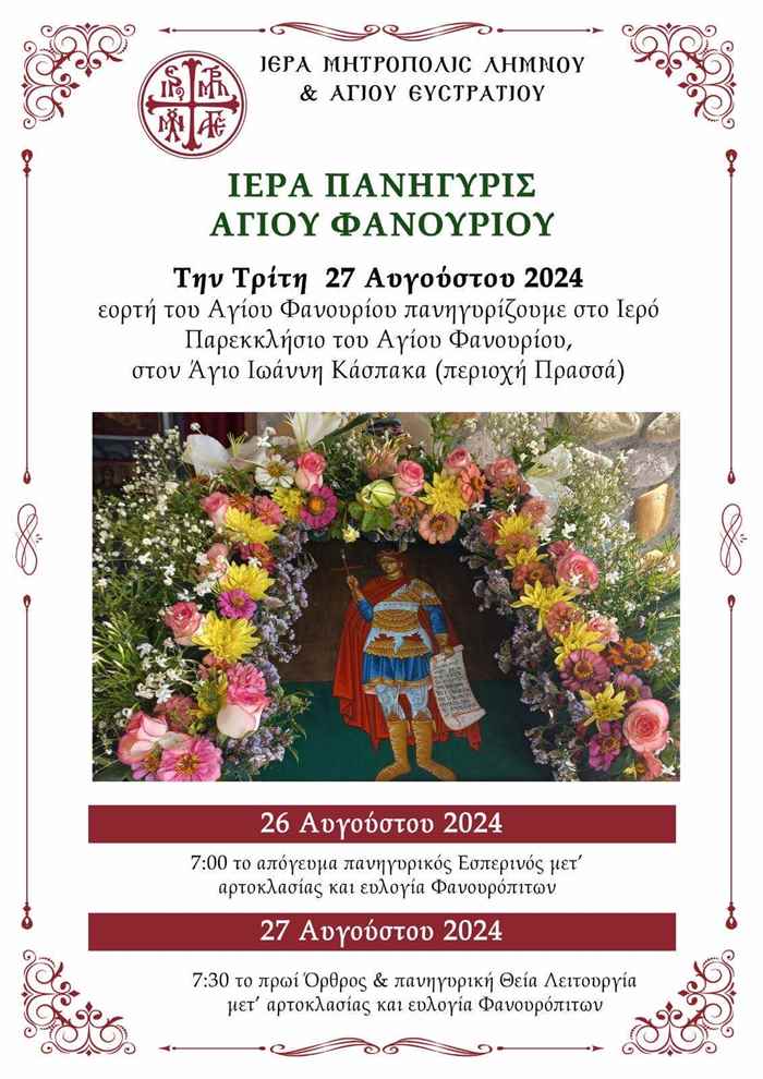 Οι εκδηλώσεις θα ξεκινήσουν την παραμονή της εορτής, τη Δευτέρα 26 Αυγούστου, με τον Πανηγυρικό Εσπερινό στις 19:00 το απόγευμα. Κατά τη διάρκεια της τελετής θα γίνει αρτοκλασία και ευλογία των Φανουρόπιτων, ενός παραδοσιακού γλυκίσματος που φτιάχνεται προς τιμήν του Αγίου, γνωστού για τη δύναμή του να φανερώνει χαμένα αντικείμενα και να προσφέρει βοήθεια στους πιστούς.