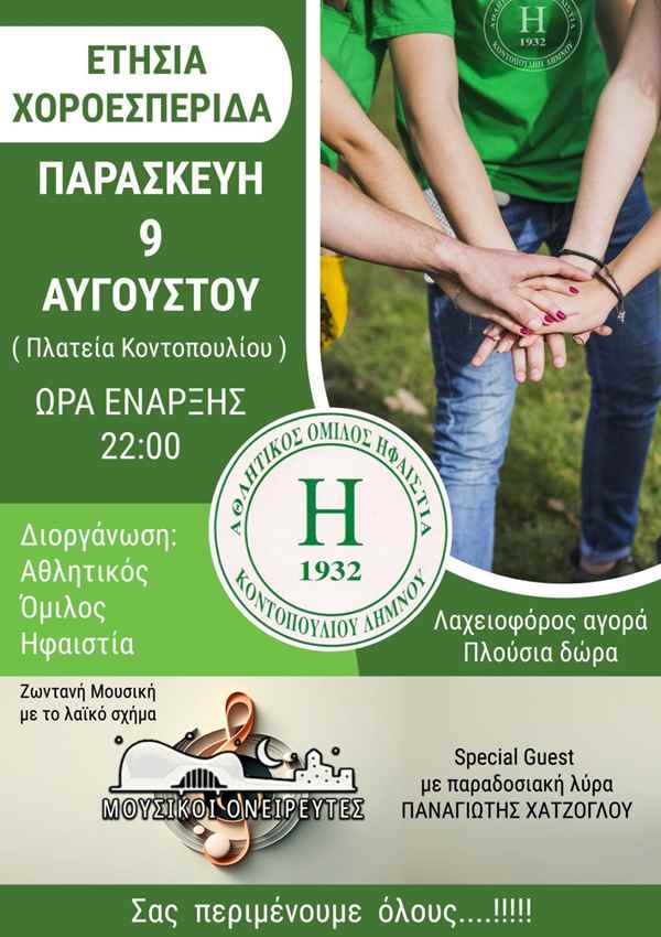 Ο Αθλητικός Όμιλος Ηφαιστία, σας προσκαλεί στην ετήσια Χοροεσπερίδα του συλλόγου σήμερα Παρασκευή 9 Αυγούστου και ώρα 10.00 στην πλατεία Κοντοπουλίου!