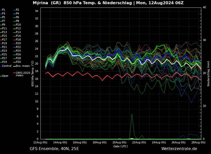 Παρακάτω δείτε διάγραμμα τάσης καιρού θερμοκρασίας και βροχοπτώσεων.Η θερμοκρασία είναι οι καμπύλες στην μέση του πίνακα που δείχνουν τα καιρικά σενάρια για την θερμοκρασία στα 850hpa(είναι στα 1500μ όπου μετράμε ως βάση την θερμοκρασία στην ατμόσφαιρα και απλά προσθέτουμε 12 βαθμούς). Η κόκκινη γραμμή δείχνει τον μέσο όρο θερμοκρασίας των 30 τελευταίων ετών. Στο κάτω μέρος στη βάση του πίνακα είναι οι βροχοπτώσεις και η άσπρη καμπύλη είναι ο μέσος όρος από 30 καιρικά σενάρια.