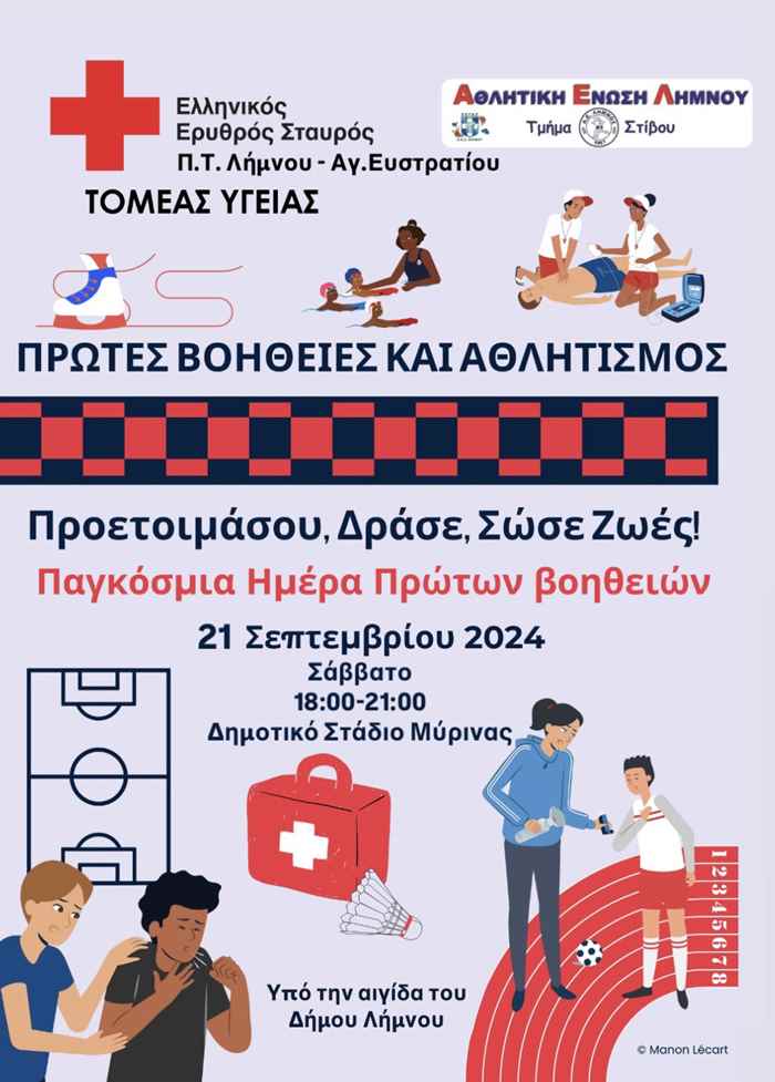 Το Π.Τ. Λήμνου- Αγίου Ευστρατίου του Ελληνικού Ερυθρού Σταυρού, στο πλαίσιο του εορτασμού της Παγκόσμιας Ημέρας Πρώτων Βοηθειών, διοργανώνει αθλητική δράση το Σάββατο 21 Σεπτεμβρίου 2024 και ώρες 6-9 μμ, στο Δημοτικό Στάδιο Μύρινας, σε συνεργασία με το Τμήμα Στίβου ΑΕΛ Λήμνου και τη υποστήριξη του Δήμου Λήμνου, για την ευαισθητοποίηση και εξοικείωση των πολιτών με τις Πρώτες Βοήθειες.