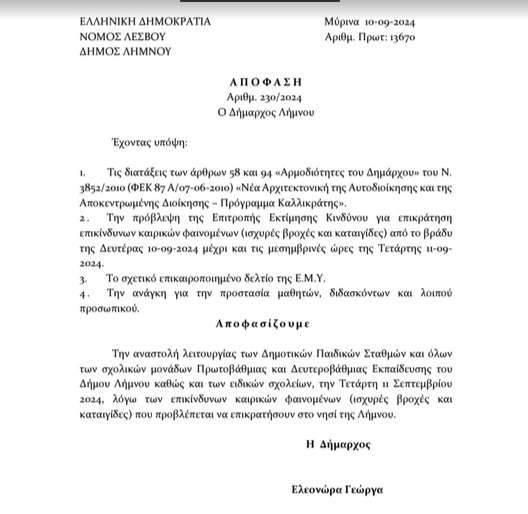Σας γνωρίζουμε ότι, με την υπ’ αριθμ. 230/2024 απόφαση της Δημάρχου Λήμνου κ. Ελεονώρας Γεώργα και μετά από τηλεφωνική επικοινωνία με τον Υπουργό Κλιματικής Κρίσης και Πολιτικής Προστασίας κ. Βασίλη Κικίλια, αναστέλλεται η λειτουργία των Δημοτικών Παιδικών Σταθμών, όλων των σχολικών μονάδων Πρωτοβάθμιας & Δευτεροβάθμιας Εκπαίδευσης και των ειδικών σχολείων του Δήμου Λήμνου, την Τετάρτη 11 Σεπτεμβρίου 2024, καθώς αναμένονται επικίνδυνα καιρικά φαινόμενα.