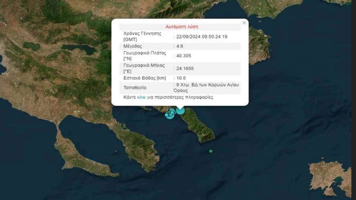 Σεισμός 4,6 Ρίχτερ έγινε στις 12:50 στην Χαλκιδική. Σύμφωνα με την αυτόματη λύση του Γεωδυναμικού Ινστιτούτου το επίκεντρο εντοπίζεται 9 Χλμ. ΒΔ των Καρυών Αγίου Όρους.