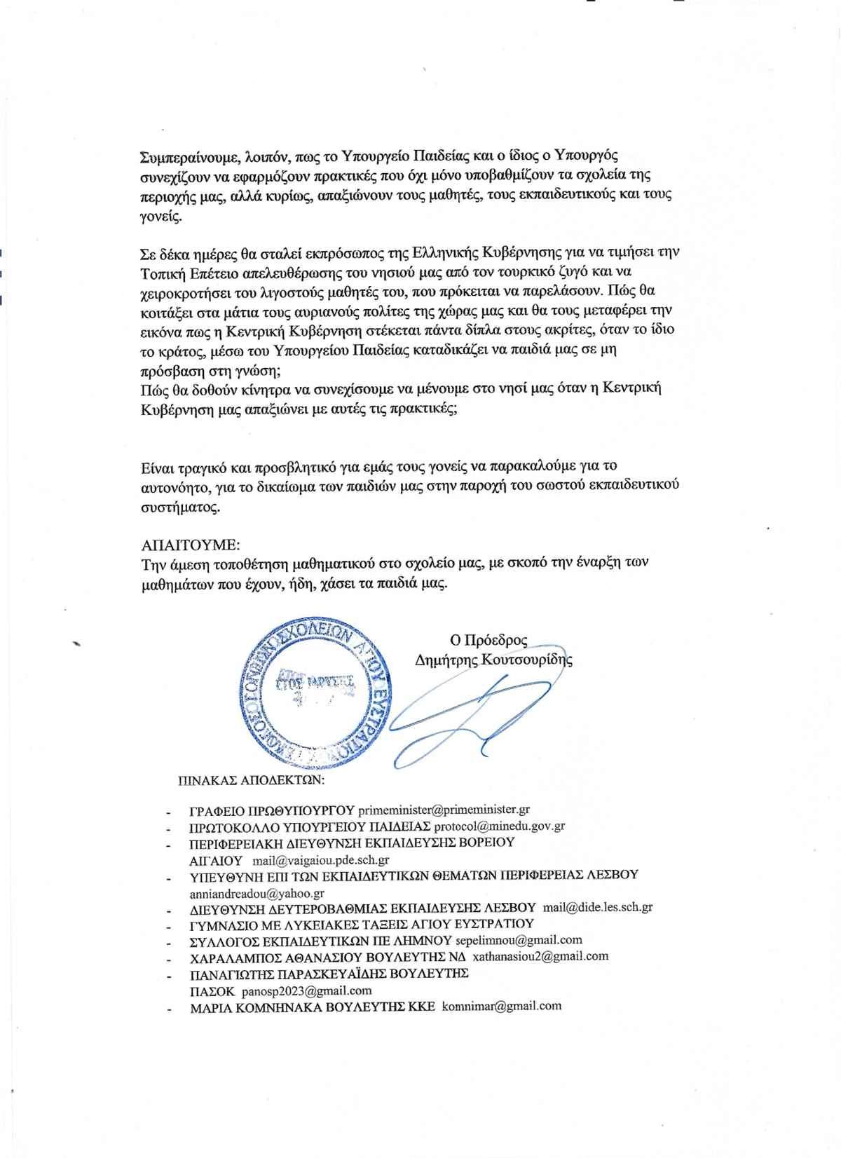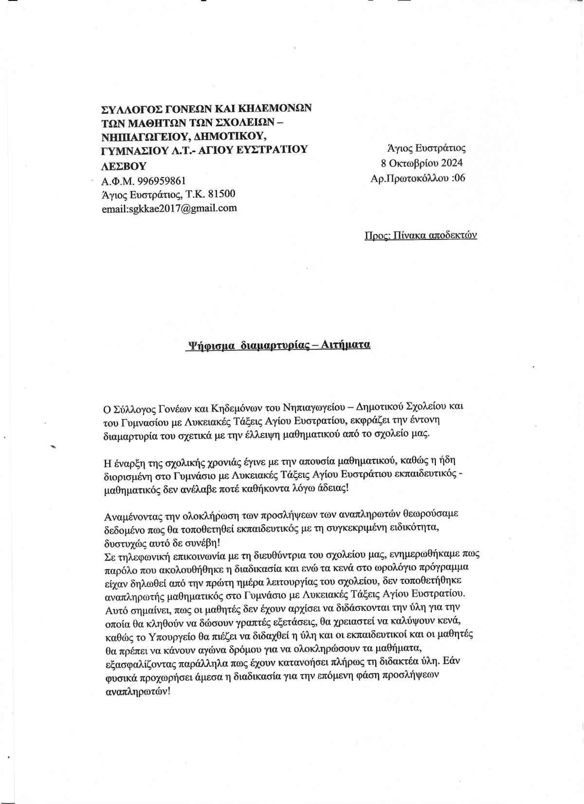 Ψήφισμα διαμαρτυρίας στον Πρωθυπουργό απέστειλε ο Σύλλογος Γονέών και Κηδεμόνων των μαθητών των σχολείων, νηπιαγωγείου, δημοτικού, γυμνάσιου του Αγίου Ευστρατίου, εκφράζοντας την έντονη διαμαρτυρία τους για την έλλειψη μαθηματικού από το σχολείο από την ημέρα που άρχισε η σχολική χρόνια απαιτώντας την άμεση τοποθέτηση
