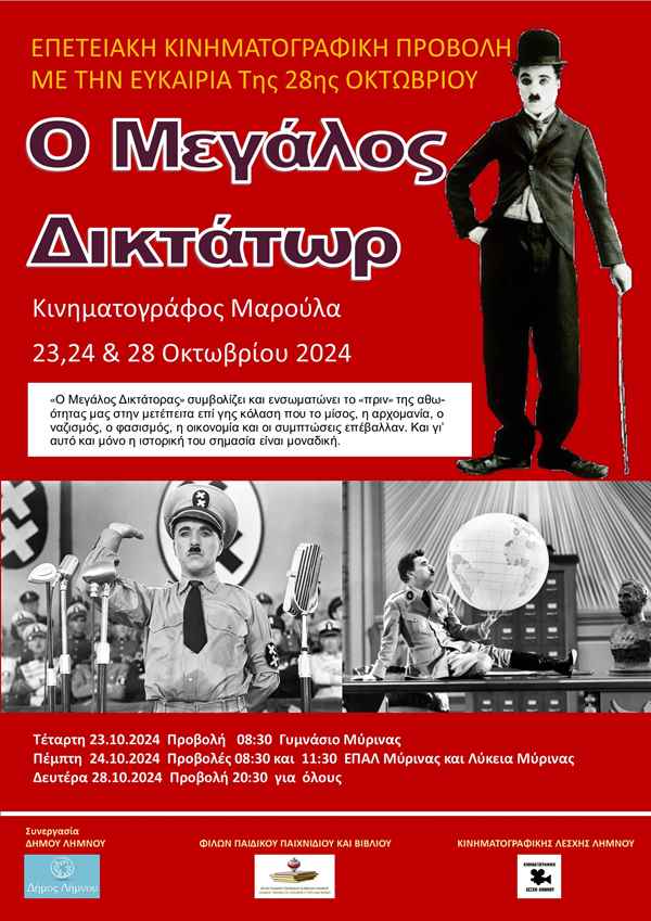 Οι Φίλοι Παιδικού Παιχνιδιού & Βιβλίου σε συνεργασία με την Κινηματογραφική Λέσχη Λήμνου παρουσιάζουν με την ευκαιρία της 28ης Οκτωβρίου το αντιπολεμικό, αντιφασιστικό αριστούργημα του Τσάρλι Τσάπλιν «Ο Μεγάλος Δικτάτωρ», την Δευτέρα 28 Οκτωβρίου στις 20.45 στον κινηματογράφο ΜΑΡΟΥΛΑ με ελεύθερη είσοδο.