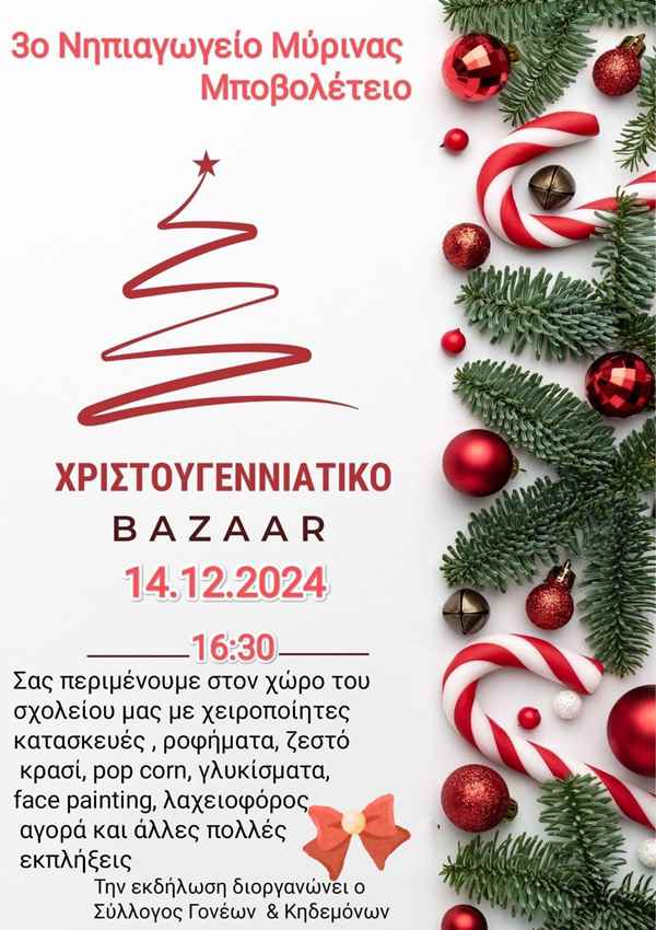 Χριστούγεννα έρχονται… ελάτε να γιορτάσουμε μαζί στο Χριστουγεννιάτικο Bazaar του 3ου Νηπιαγωγείου Μύρινας – Μποβολέτειου!