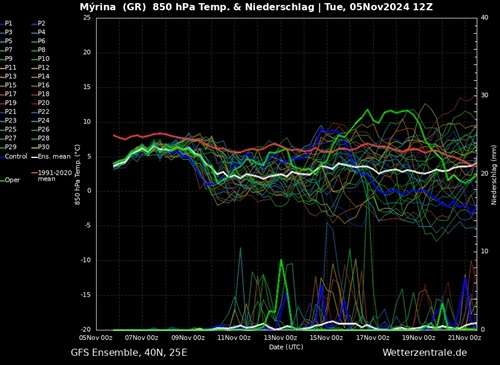 Τα τωρινά στοιχεία συνεχίζουν να δίνουν με αυξημένες πιθανότητες βροχοπτώσεις από 15/11/24 και μετά, με θερμοκρασίες 2-3 βαθμούς κάτω από μέσο όρο για την εποχή που διανύουμε 12-13 βαθμοί μέγιστη θερμοκρασία περίπου.Βέβαια είμαστε ακόμα μακριά ακόμα για ασφαλή πρόγνωση (έχουμε δει αλλαγές προς στη συνέχιση της ανομβρίας ενώ φαινόντουσαν βροχές στο παρά 5) και γιαυτό το λόγο θα υπάρχει συνεχής ενημέρωση.