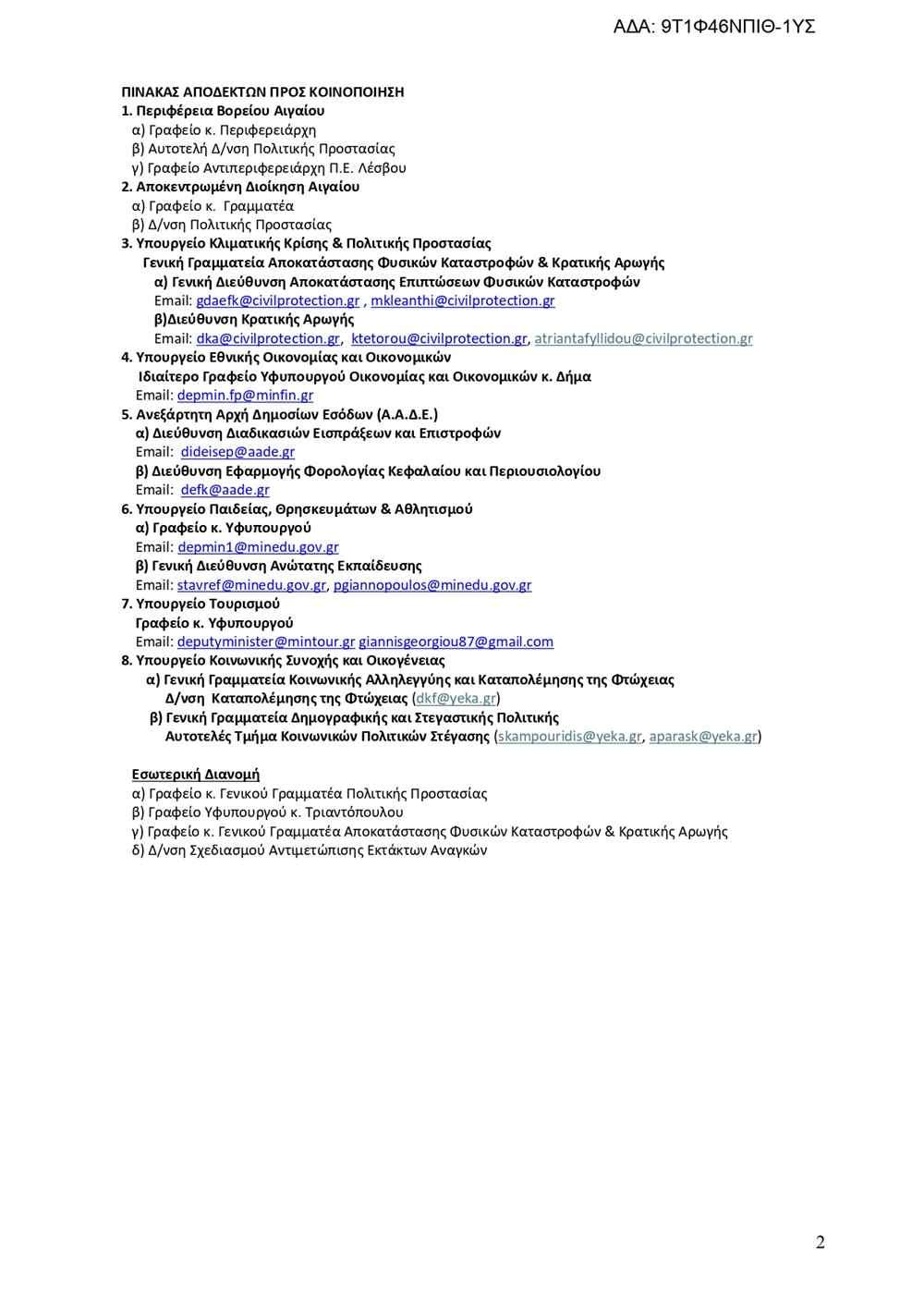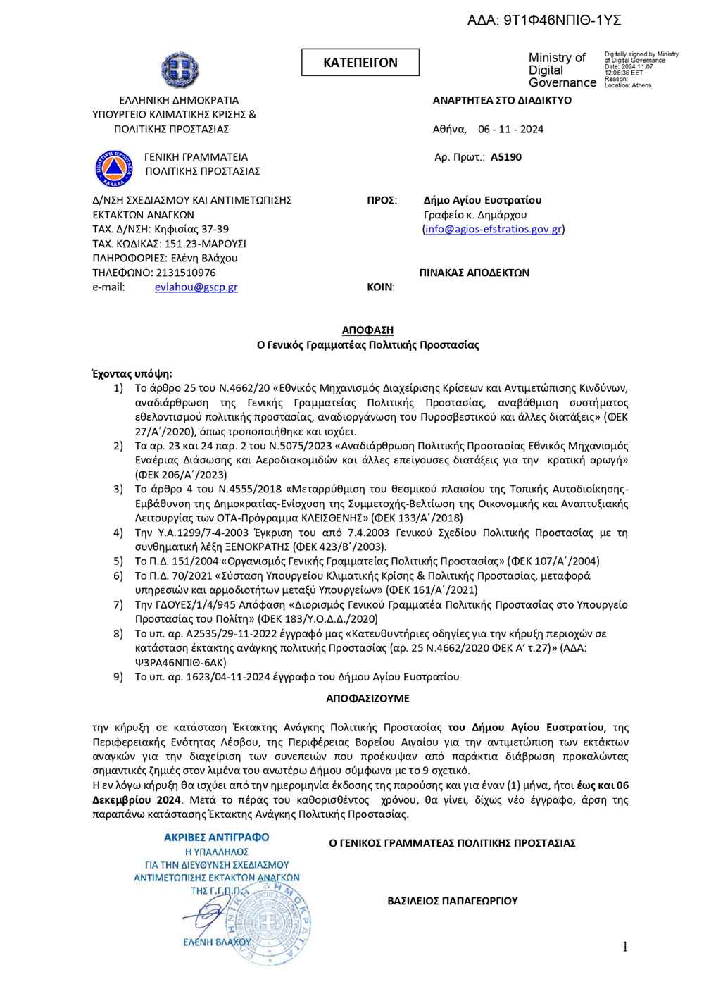 Μετά την επιστολή του Δημάρχου Αγίου Ευστρατίου 1623 στις 4 Νοεμβρίου η Γενική Δ/ΝΣΗ ΣΧΕΔΙΑΣΜΟΥ ΚΑΙ ΑΝΤΙΜΕΤΩΠΙΣΗΣ ΕΚΤΑΚΤΩΝ ΑΝΑΓΚΩΝ απάντησε θετικά την κήρυξη σε κατάσταση Έκτακτης Ανάγκης Πολιτικής Προστασίας του Δήμου Αγίου Ευστρατίου, της Περιφερειακής Ενότητας Λέσβου, της Περιφέρειας Βορείου Αιγαίου για την αντιμετώπιση των εκτάκτων αναγκών για την διαχείριση των συνεπειών που προέκυψαν από παράκτια διάβρωση προκαλώντας σημαντικές ζημιές στον λιμένα του ανωτέρω Δήμου σύμφωνα με το 9 σχετικό.