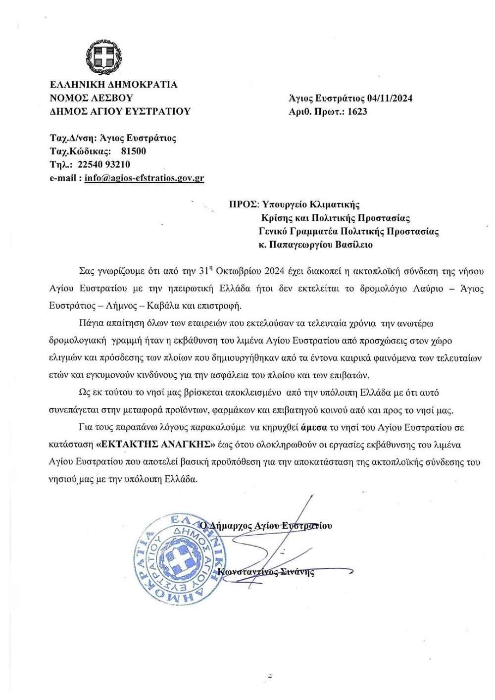 Η επιστολή του Δημάρχου Αγίου Ευστρατίου