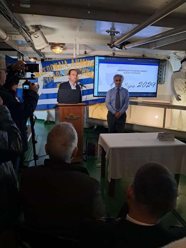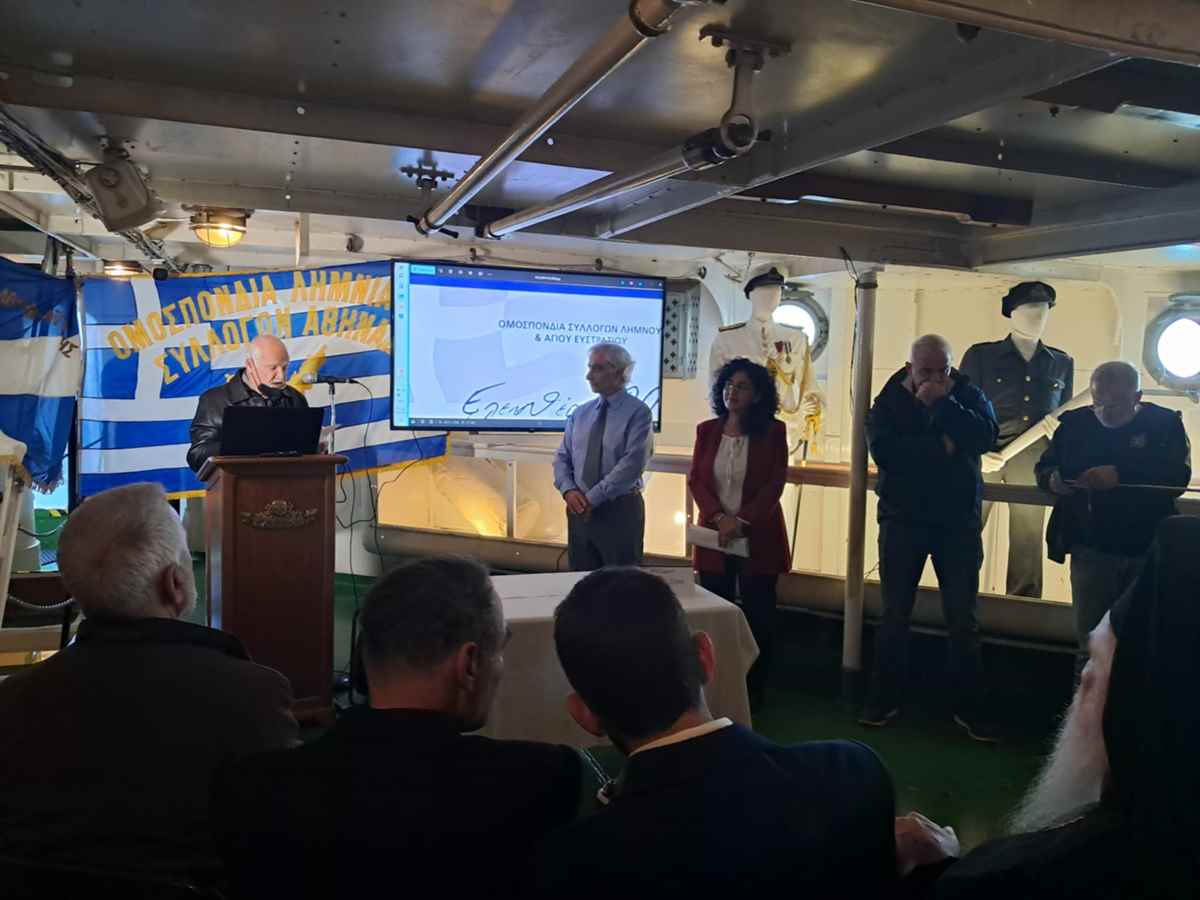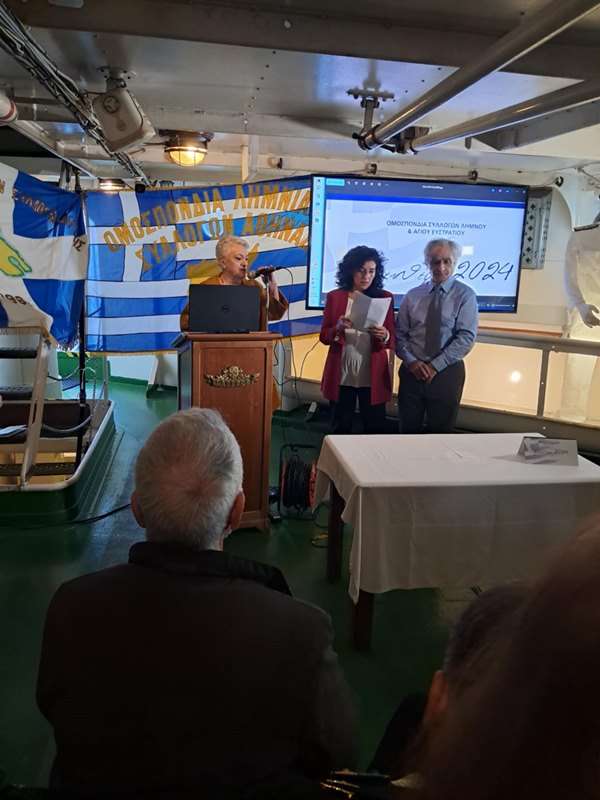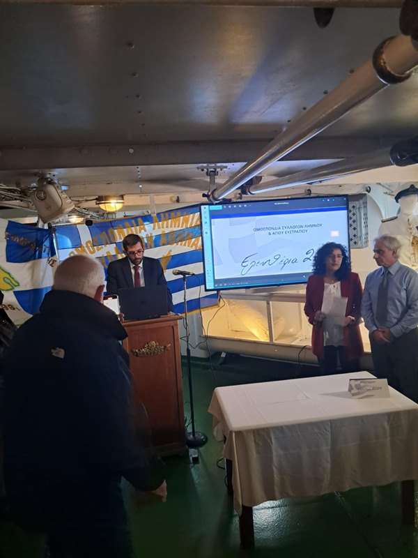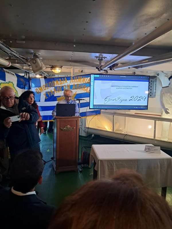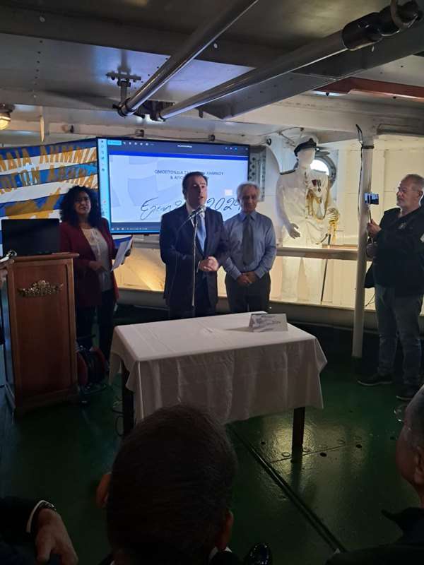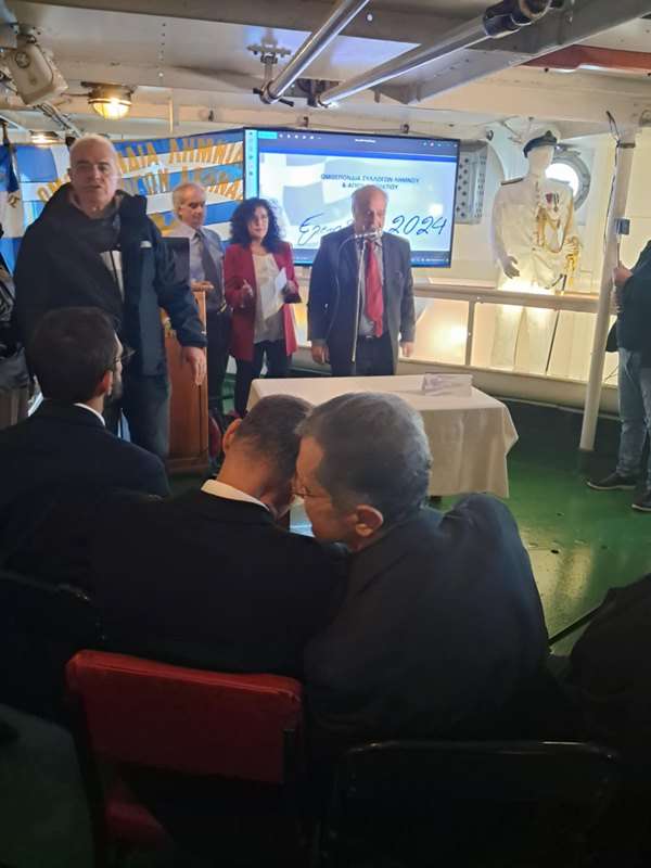 Ο Πρόεδρος της ΟΛΣΥ, κ. Αντώνιος Καραγιάννης, στην ομιλία του έβαλε διεκδικητικό πλαίσιο και αναφέρθηκε στον ακτοπλοϊκό αποκλεισμό του νησιού του Αγίου Ευστρατίου. Ευχαρίστησε τον Αντιναύαρχο, κ. Καλογερόπουλο και όλο το πλήρωμα του θωρηκτό για την πολύμηνη συνεργασία τους.