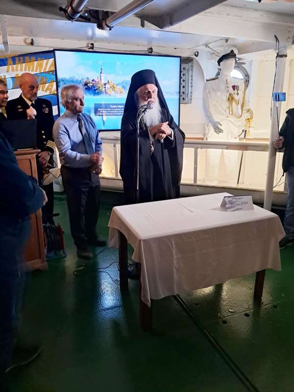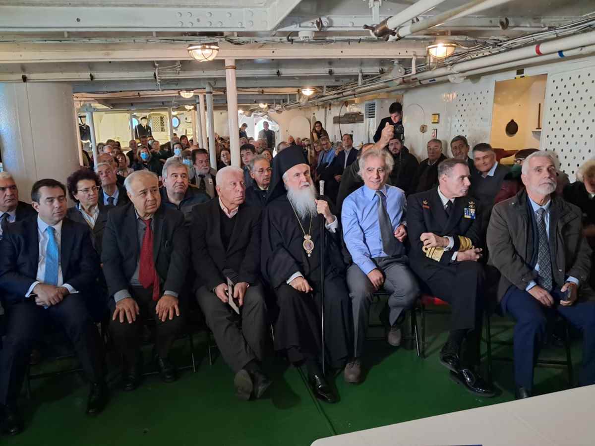 Η εκδήλωση ξεκίνησε με τη δοξολογία, τελεσθείσα από τον Σεβασμιώτατο Μητροπολίτη Λήμνου και Αγίου Ευστρατίου, κ. Ιερόθεο. Οι παρευρισκόμενοι είχαν τη θερμή υποδοχή του Κυβερνήτη και Διευθυντή του Πλωτού Ναυτικού Μουσείου του θωρηκτού «Γ. Αβέρωφ», Αντιναυάρχους Ιωάννη Καλογερόπουλου, Π.Ν.