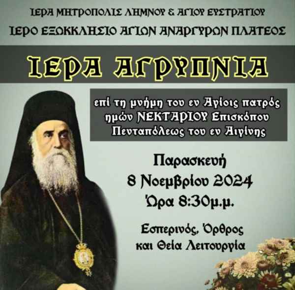 Προσκαλούνται όλοι οι ευσεβείς Χριστιανοί να συμμετάσχουν στην Ιερά Αγρυπνία, να ενώσουν τις προσευχές τους και να παρακαλέσουν τον Άγιο Νεκτάριο για υγεία, ειρήνη και δύναμη, μέσα σε μία ατμόσφαιρα βαθιάς πνευματικότητας