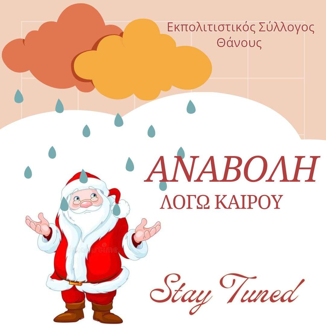 Λόγω των προβλεπόμενων κακών καιρικών συνθηκών που θα επικρατήσουν το Σαββατοκύριακο ο Εκπολιτιστικός Σύλλογος Θάνους αναγκάζεται να αναβάλει την πολυαναμενόμενη Χριστουγεννιάτικη εκδήλωση του εκδήλωση στο Θάνος για δεύτερη φορά.