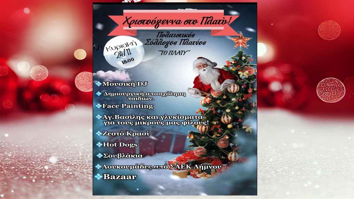 Ελάτε να μοιραστούμε τη χαρά των Χριστουγέννων με τον Σύλλογο “Το Πλατύ” και να νιώσουμε την αγάπη και τη θαλπωρή των γιορτών. Και ποιος ξέρει; Φέτος, μπορεί κι εσείς να αγαπήσετε λίγο παραπάνω τα Χριστούγεννα!