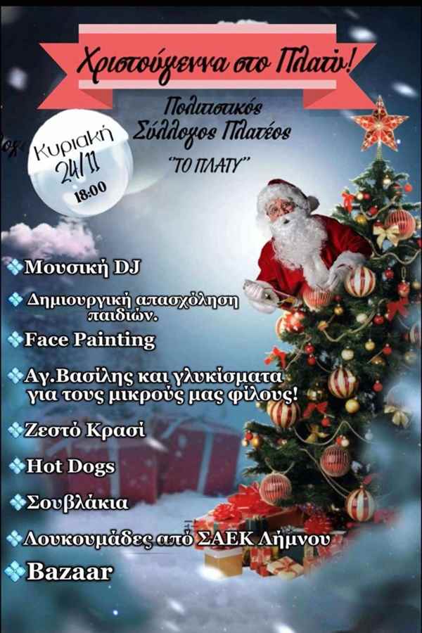 Ελάτε να μοιραστούμε τη χαρά των Χριστουγέννων με τον Σύλλογο “Το Πλατύ” και να νιώσουμε την αγάπη και τη θαλπωρή των γιορτών. Και ποιος ξέρει; Φέτος, μπορεί κι εσείς να αγαπήσετε λίγο παραπάνω τα Χριστούγεννα!