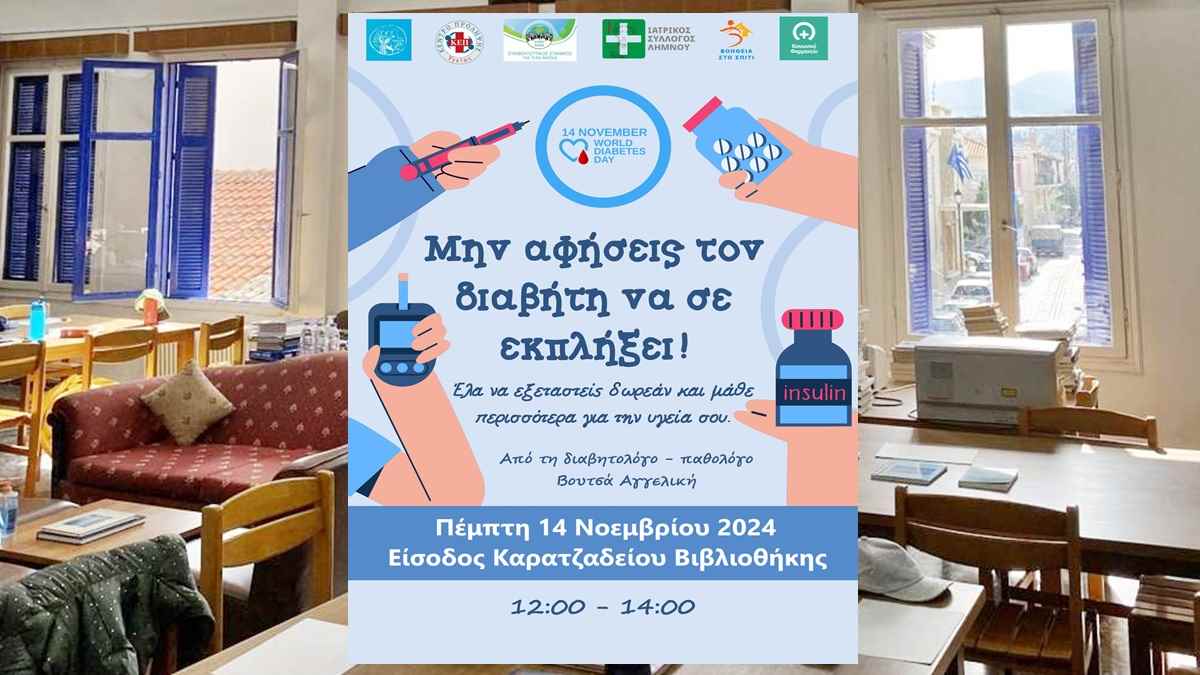 Με αφορμή την Παγκόσμια Ημέρα Διαβήτη σήμερα 14 Νοεμβρίου, το Κέντρο Πρόληψης για την Υγεία, ο Συμβουλευτικός Σταθμός για την Άνοια, το Βοήθεια στο Σπίτι, το Κέντρο Ημερήσιας Φροντίδας Ηλικιωμένων και ο Ιατρικός Σύλλογος Λήμνου σας προσκαλούν να συμμετάσχετε σε μια δράση ευαισθητοποίησης και πρόληψης για την υγεία μας. Στόχος μας είναι η ενημέρωση του κοινού και η πρώιμη διάγνωση του διαβήτη, ώστε να αντιμετωπιστεί αποτελεσματικά και να ενισχυθεί η ποιότητα ζωής των ατόμων που επηρεάζονται.