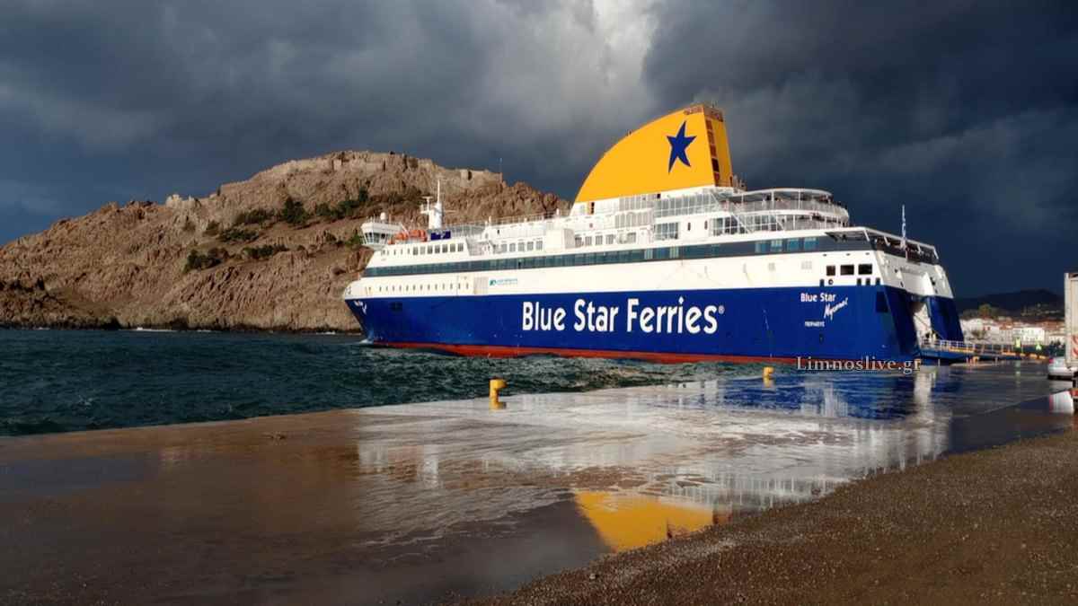 Έξω από το λιμάνι περίμενε το Blue Star Myconos, έτοιμο να δέσει προερχόμενο από τη Μυτιλήνη μόλις ολοκληρωνόταν η διαδικασία με τον Πελαγίτη.