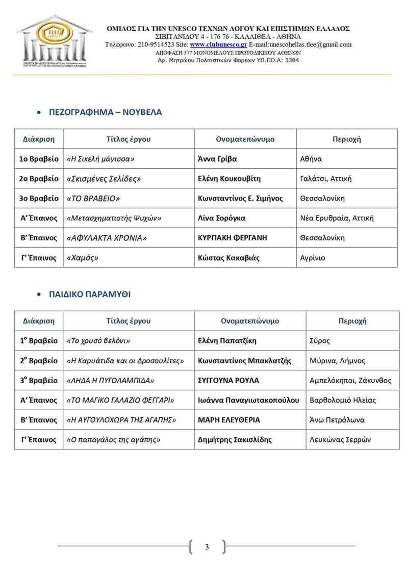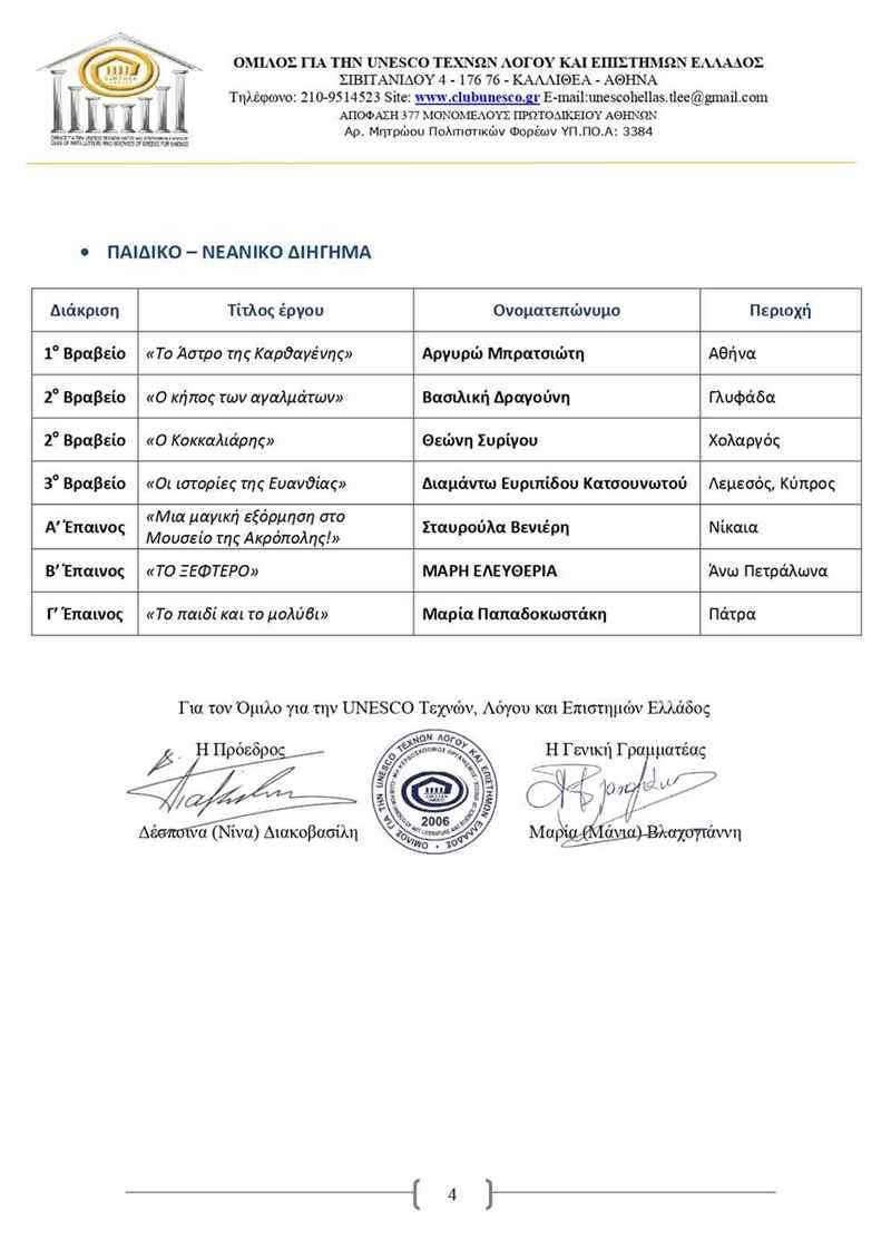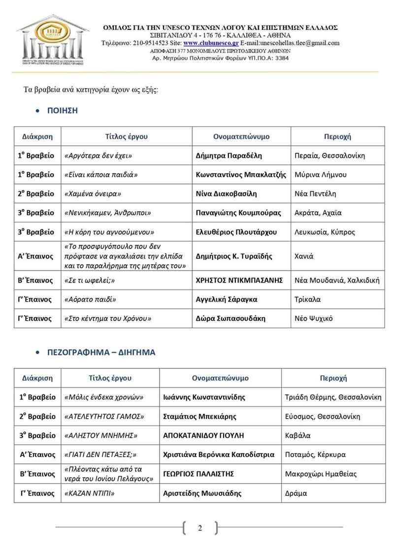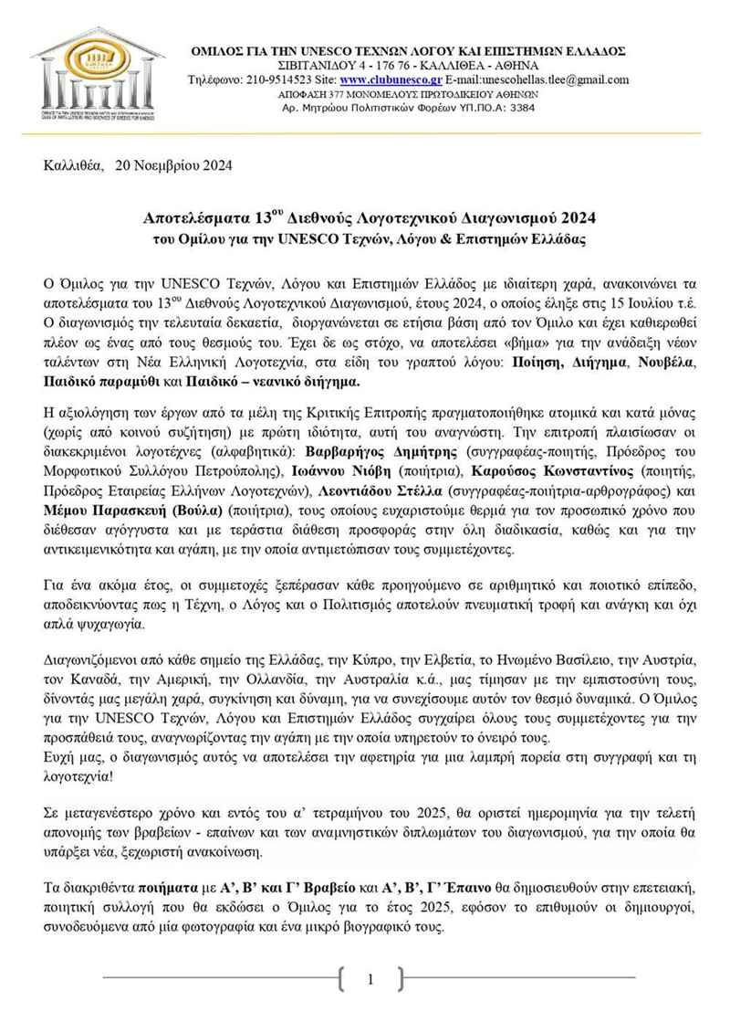 Η ανακοίνωση της UNESCO για τα αποτελέσματα του 13ου Λογοτεχνικού Διαγωνισμού