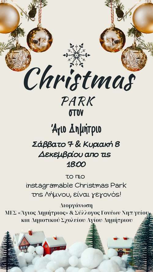 Ο ΜΕΣ «Άγιος Δημήτριος» και ο Σύλλογος Γονέων Δημοτικού και Νηπιαγωγείου Αγίου Δημητρίου για την περίοδο των Χριστουγέννων δημιουργούν και παρουσιάζουν «Το Πάρκο των Χριστουγέννων», που φέτος μεταμορφώνεται σε ένα πρωτότυπο Instagramable Christmas Park!