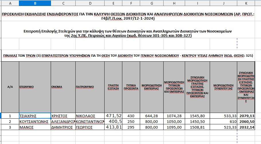 Για το Νοσοκομείο Λήμνου πρώτος στη λίστα είναι ο Τσιαχρής Χρήστος δεύτερος ο Αλέξανδρος Κουτσαντώνης και τρίτος ο Δημήτριος Μάνος