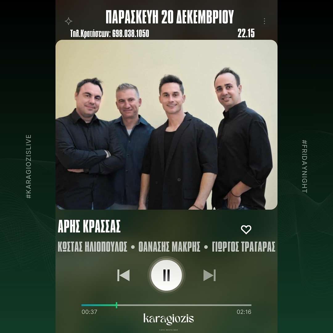 Την Παρασκευή 20 Δεκεμβρίου, στις 22:15, ο μοναδικός Άρης Κρασσάς ανεβαίνει στη σκηνή του Karagiozis Bar μαζί με την εκπληκτική ορχήστρα του: