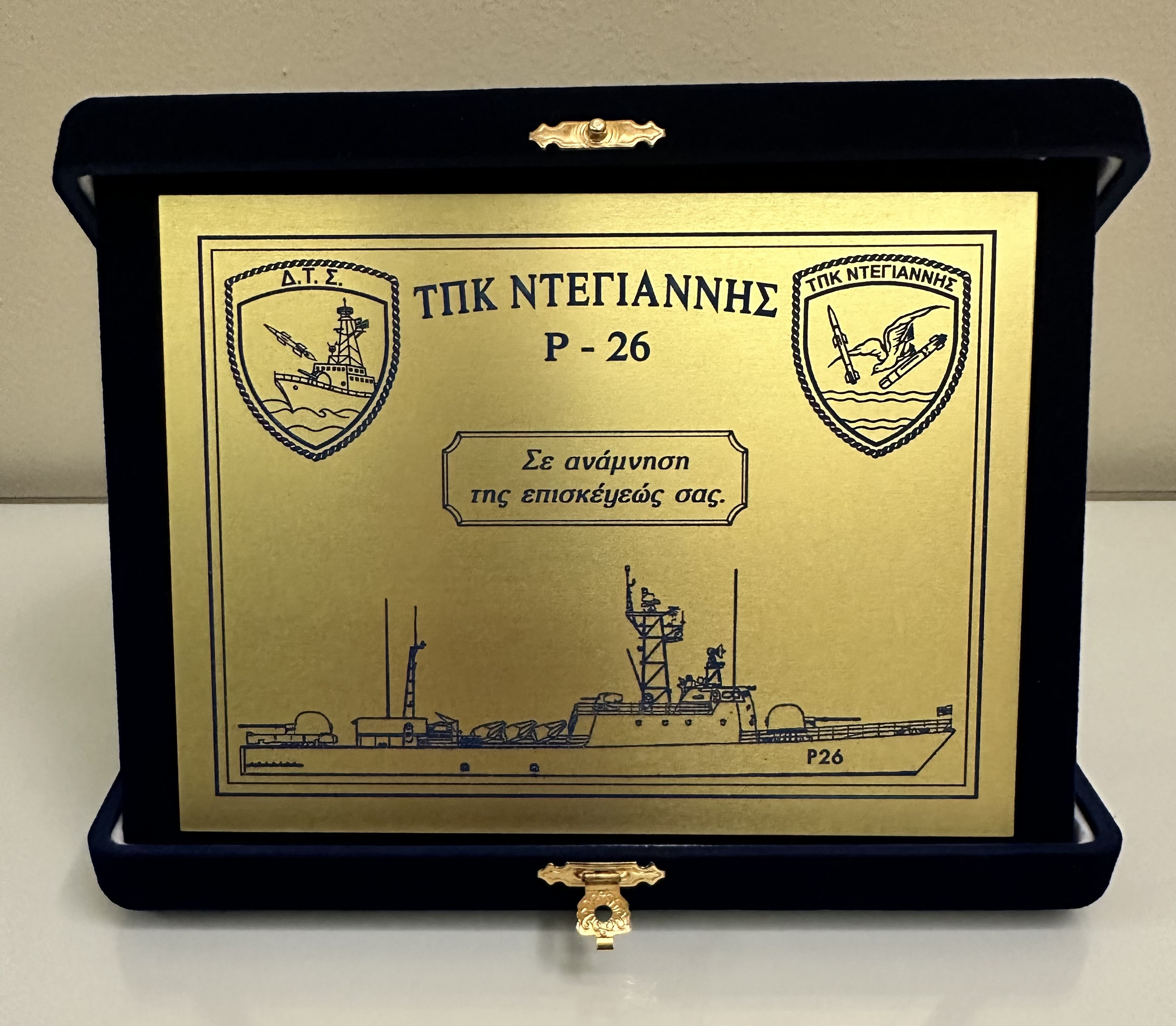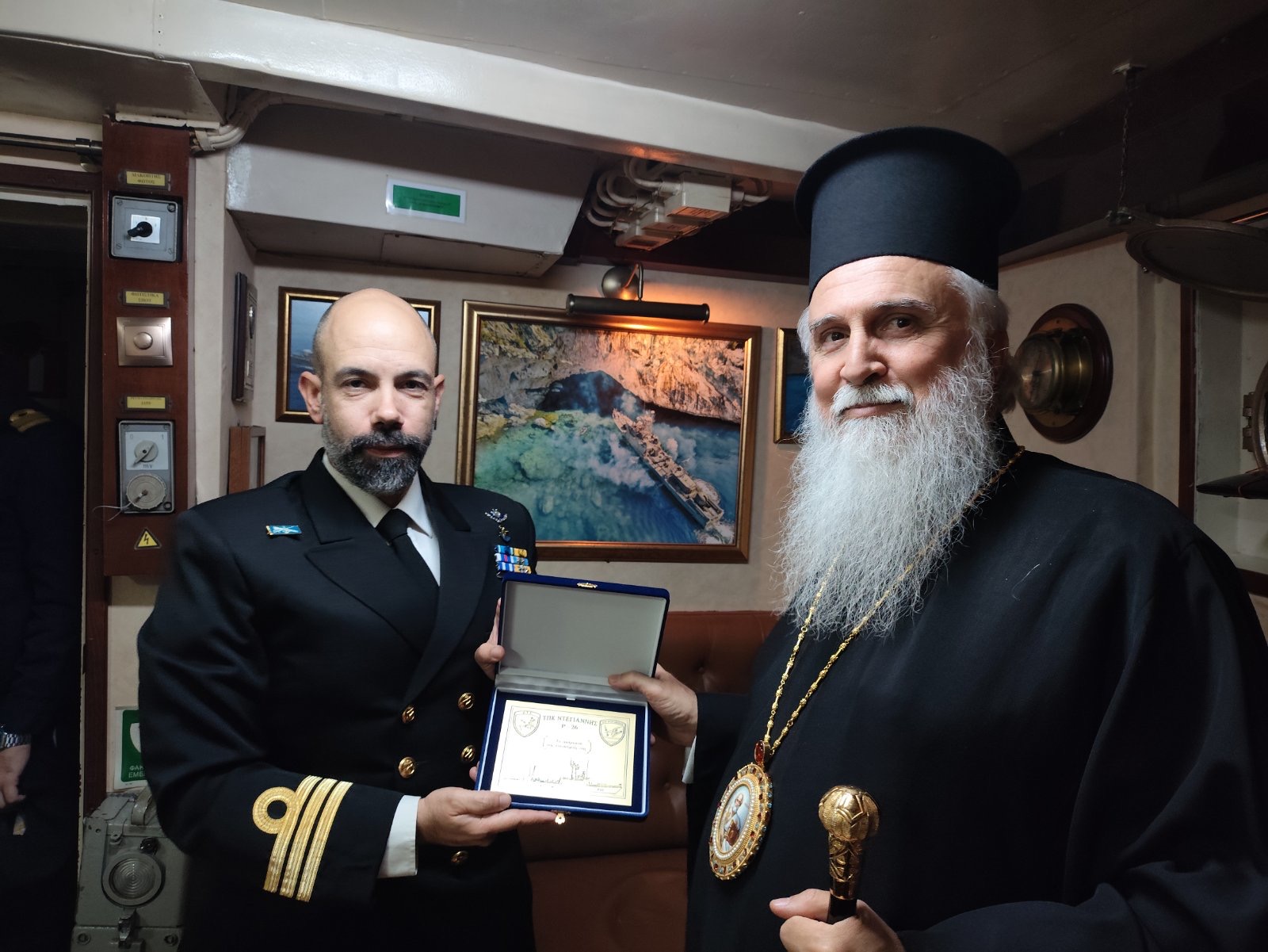 Ο Κυβερνήτης, αφού ευχαρίστησε εκ μέρους όλου του πληρώματος τον Σεβ. Ποιμενάρχη μας για την επίσκεψη, τον βεβαίωσε ότι αυτή ενισχύει και ανεφοδιάζει τις δυνάμεις τους και του επέδωσε αναμνηστική πλακέτα με τον θυρεό του πολεμικού πλοίου.