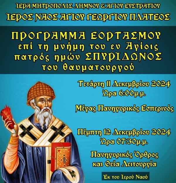Τη 12η του μηνός Δεκεμβρίου η Αγία μας Εκκλησία εορτάζει την μνήμη του εν Αγίοις Πατρός ημών Σπυρίδωνος, Επισκόπου Τριμυθούντος του Θαυματουργού, Πολιούχου και Προστάτου της νήσου Κερκύρας και της πόλεως του Πειραιά.