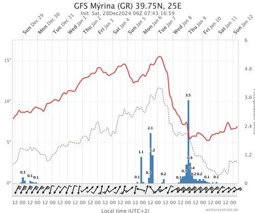 Κακοκαιρία με βροχές και καταιγίδες κατά περιόδους με διαστήματα πρόσκαιρης βελτίωσης και σταδιακή πτώση της θερμοκρασίας σε επίπεδα κάτω από τις κανονικές τιμές φαίνεται από τις 5/1/25 και μετά.