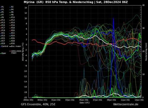 Η θερμοκρασία είναι οι καμπύλες στην μέση του πίνακα που δείχνουν τα καιρικά σενάρια για την θερμοκρασία στα 850hpa(είναι στα 1500μ όπου μετράμε ως βάση την θερμοκρασία στην ατμόσφαιρα και απλά προσθέτουμε 8 βαθμούς). Η κόκκινη γραμμή δείχνει τον μέσο όρο θερμοκρασίας των 30 τελευταίων ετών.Στο κάτω μέρος στη βάση του πίνακα είναι οι βροχοπτώσεις όπου αν υπάρχει μία ανακατωσούρα στις καμπύλες τότε αυξάνεται η πιθανότητα για βροχές και η άσπρη καμπύλη είναι ο μέσος όρος από 30 καιρικά σενάρια.