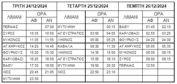 Αναχώρηση από Λαύριο την Τρίτη 24/12/2024 στις 04:30 (αντί 23/12/2024 στις 22:30) για Λήμνο 13:10-14:00, Καβάλα 18:15-19:45, Λήμνο 23:59-00:30, Λαύριο 08:55 και κατόπιν ως εγκεκριμένα