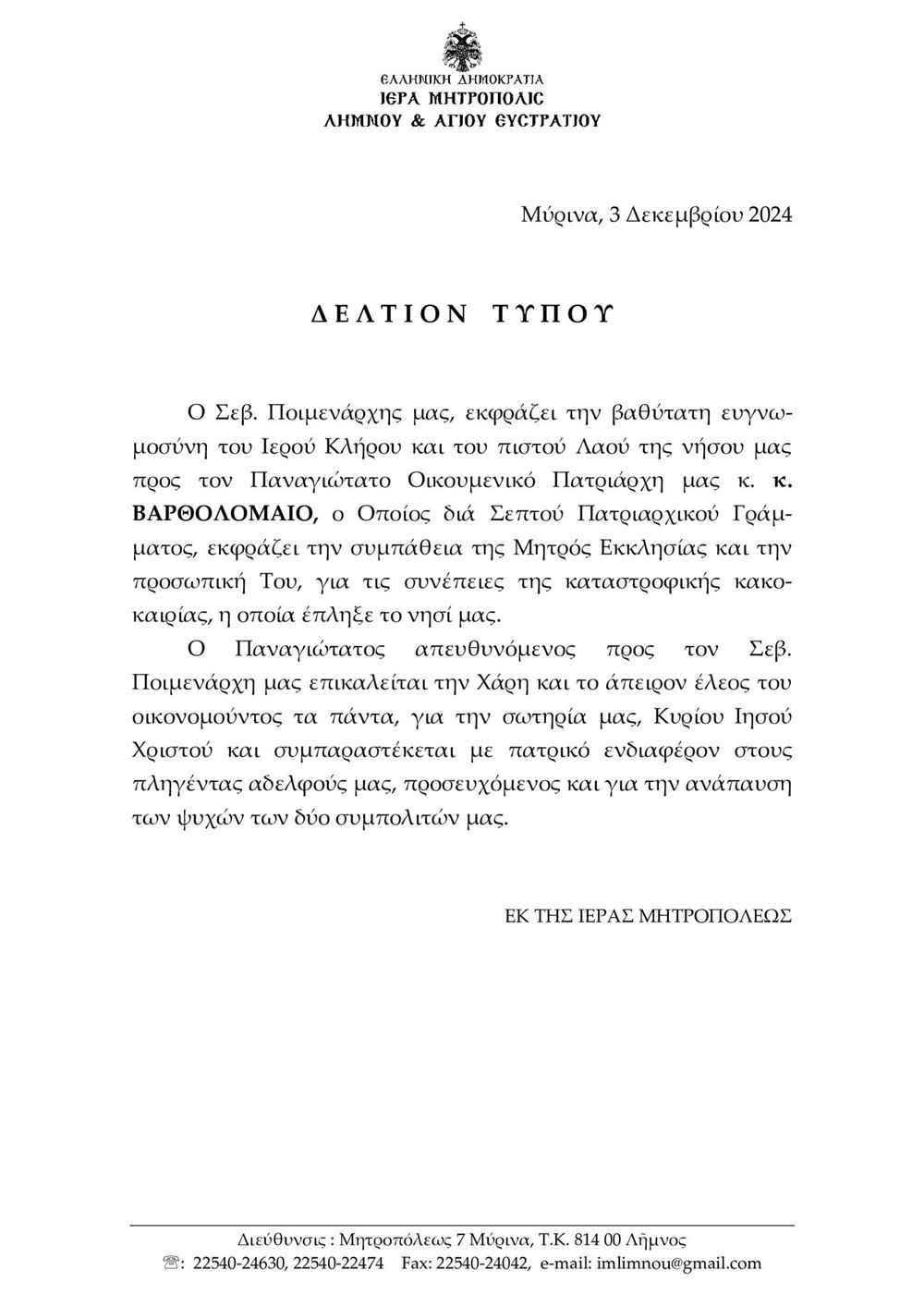 Ο Μητροπολίτης Λήμνου εξέφρασε “την βαθύτατη ευγνωμοσύνη του Ιερού Κλήρου και του πιστού Λαού της νήσου μας προς τον Παναγιώτατο Οικουμενικό Πατριάρχη μας κ. κ. Βαρθολομαίο“.