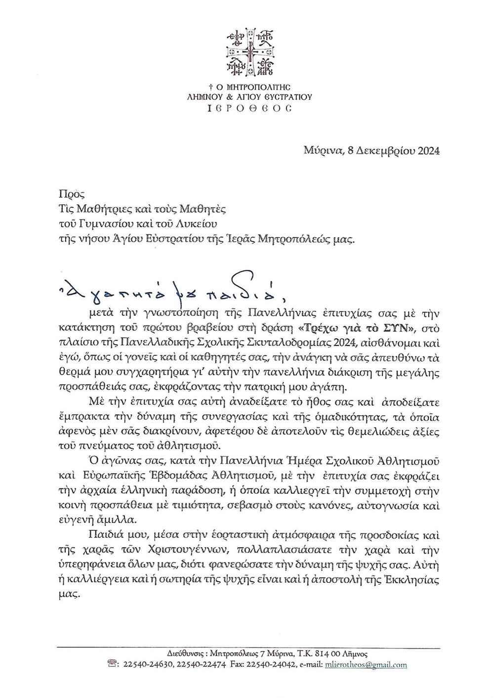 Ο Μητροπολίτης Λήμνου και Αγίου Ευστρατίου κ. Ιερόθεος εξέφρασε τα θερμά του συγχαρητήρια στις μαθήτριες και τους μαθητές του Γυμνασίου και Λυκείου του Αγίου Ευστρατίου για την Πανελλήνια επιτυχία τους, κατακτώντας το πρώτο βραβείο στη δράση “Τρέχω για το ΣΥΝ”, στο πλαίσιο της Πανελλαδικής Σχολικής Σκυταλοδρομίας 2024.