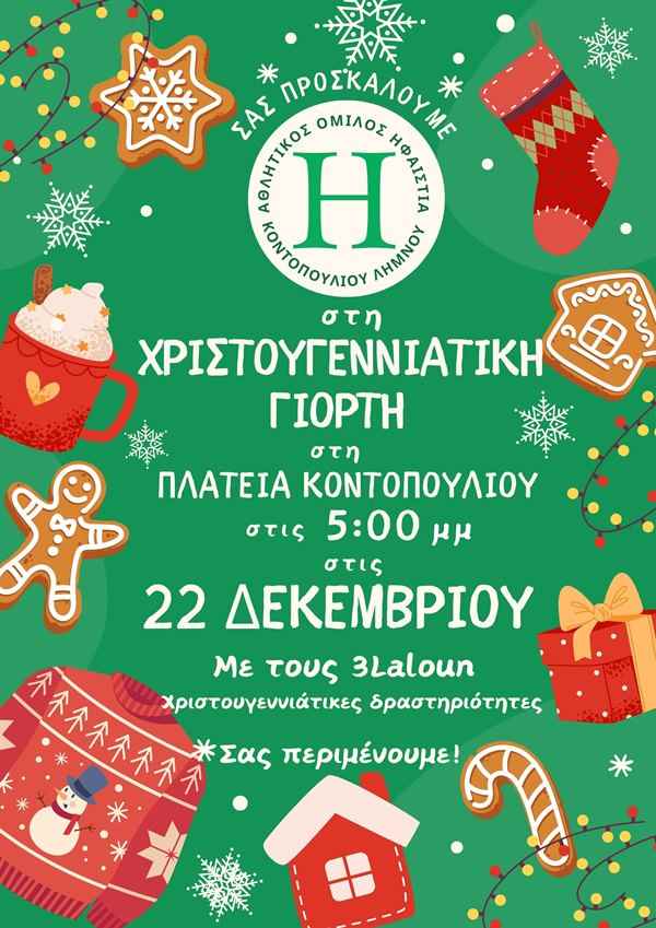 Η Χριστουγεννιάτικη ατμόσφαιρα κατακλύζει το Κοντοπούλι της Λήμνου, καθώς ο Αθλητικός Όμιλος ΗΦΑΙΣΤΙΑ σας προσκαλεί στη Χριστουγεννιάτικη Γιορτή που θα πραγματοποιηθεί την Κυριακή, 22 Δεκεμβρίου, στις 5:00 μ.μ., στην Πλατεία Κοντοπουλίου.