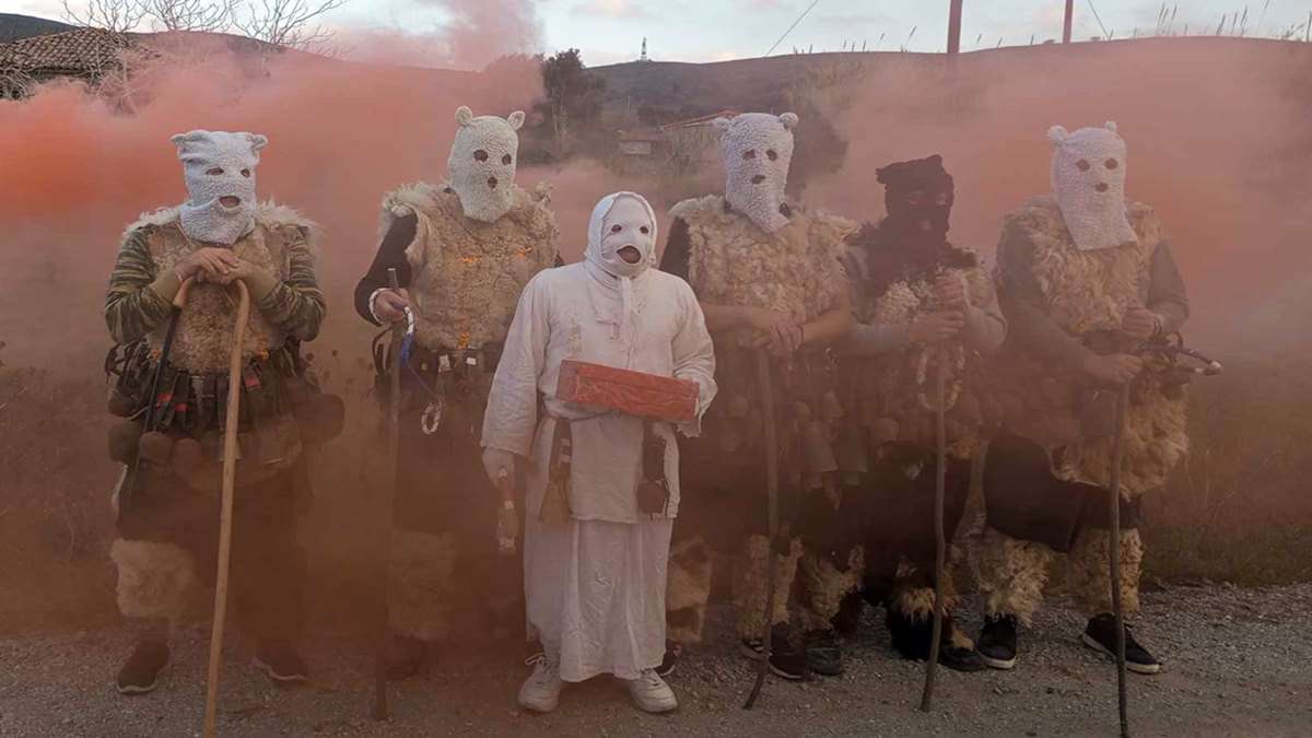 Φορούν προβιές ζώων, ζώνονται με αρμαθιές κουδουνιών που παράγουν δυνατό θόρυβο σε κάθε τους κίνηση και βάφουν τα πρόσωπά τους. Με ραβδιά στο χέρι, φοβερίζουν τους περαστικούς, διατηρώντας ζωντανό το πνεύμα του εθίμου. Ένας εξ αυτών, ντυμένος στα λευκά, γνωστός ως “Αλευρούς”, συμβολίζει την αγνότητα και οδηγεί την ομάδα στην αποστολή της: να διώξει τα κακά πνεύματα από το χωριό.