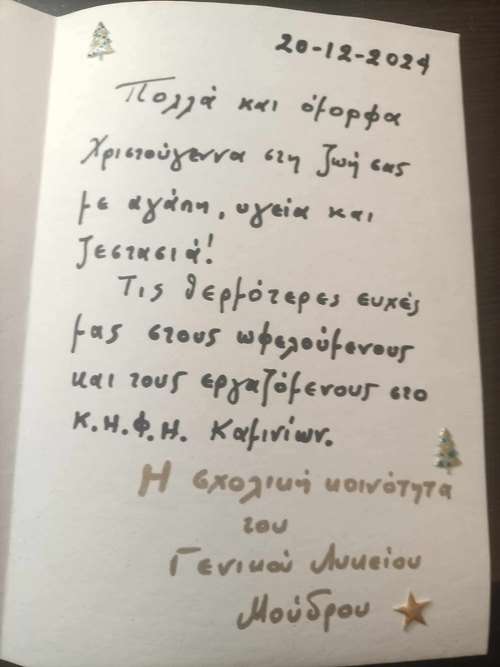 Το Κέντρο Ημερήσιας Φροντίδας Ηλικιωμένων δέχθηκε λίγο πριν τα Χριστούγεννα μία επίσκεψη καρδιάς από τη Διευθύντρια και τους μαθητές του Γενικού Λυκείου Μούδρου, οι οποίοι έψαλαν τα κάλαντα και προσέφεραν κεράσματα και δώρα στους ωφελούμενους και το προσωπικό της δομής.