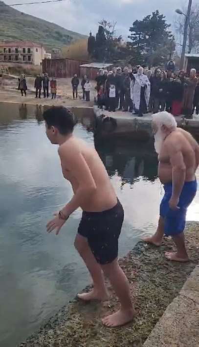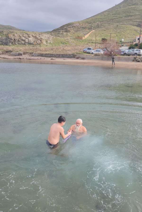 Ο Αλέξανδρος, μαζί με έναν ακόμη τολμηρό ενήλικα, αψήφησαν το τσουχτερό κρύο και βούτηξαν στα νερά, ακολουθώντας την παράδοση.