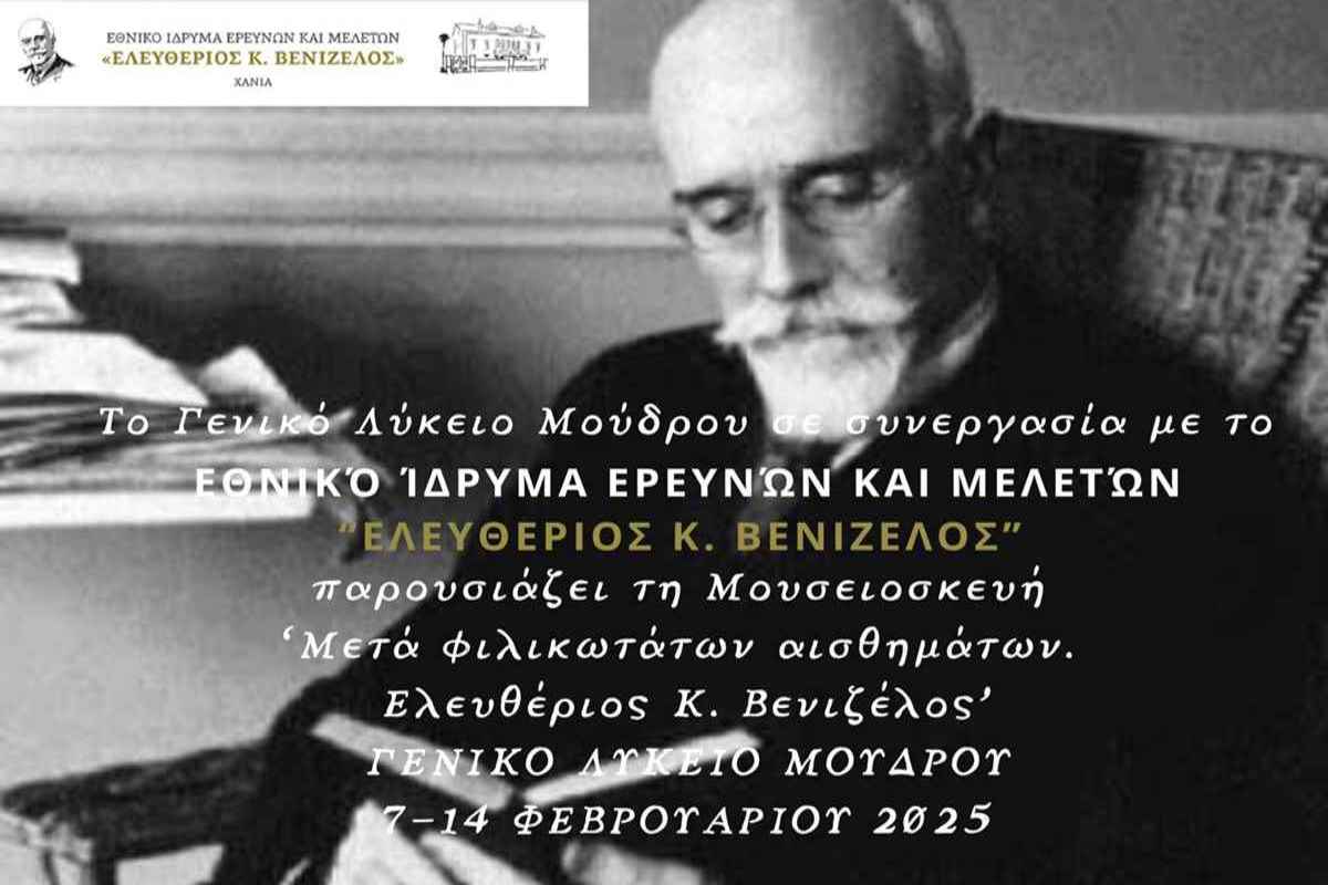 Το Γενικό Λύκειο Μούδρου ανακοίνωσε τη φιλοξενία της μουσειοσκευής “Μετά φιλικωτάτων αισθημάτων… Ελευθέριος Κ. Βενιζέλος” από τις 7 έως τις 14 Φεβρουαρίου 2025.
