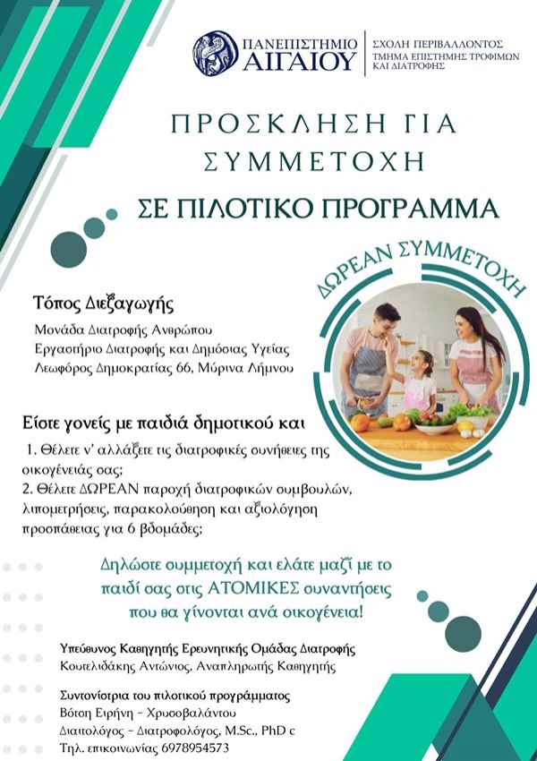 Εάν είστε γονείς με παιδιά Δημοτικού που ενδιαφέρεστε να υιοθετήσετε οικογενειακώς καλύτερες διατροφικές συνήθειες, μπορείτε να συμμετάσχετε ΔΩΡΕΑΝ εσείς και τα παιδιά σας στο Πιλοτικό Πρόγραμμα Διατροφικής Αγωγής του Πανεπιστημίου Αιγαίου – Τμήμα Επιστήμης Τροφίμων και Διατροφής, που θα ξεκινήσει αρχές Μαρτίου.