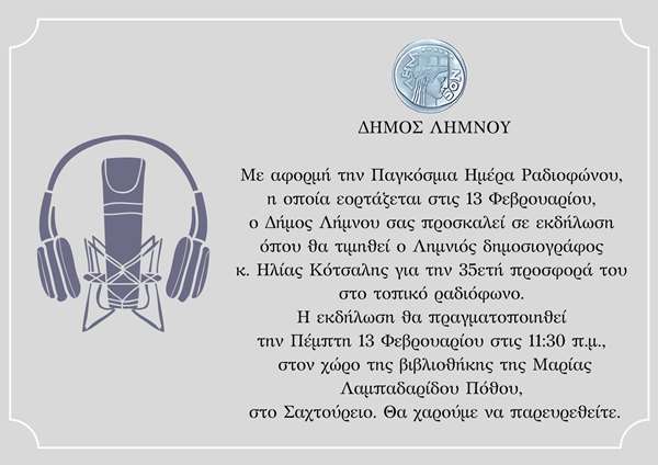 Με αφορμή την Παγκόσμια Ημέρα Ραδιοφώνου, που εορτάζεται κάθε χρόνο στις 13 Φεβρουαρίου, ο Δήμος Λήμνου διοργανώνει μια ιδιαίτερη εκδήλωση για να τιμήσει τον Λημνιό δημοσιογράφο κ. Ηλία Κότσαλη. Η εκδήλωση πραγματοποιείται με στόχο να αναγνωριστεί η 35ετής συνεισφορά του στο τοπικό ραδιόφωνο, η οποία αποτελεί σημαντικό κεφάλαιο στην ενημέρωση και ψυχαγωγία του νησιού.