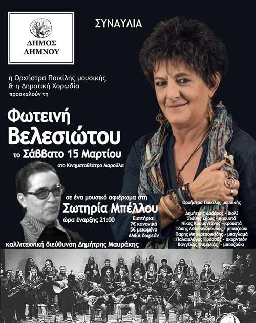 Ο Δήμος Λήμνου παρουσιάζει τη Φωτεινή Βελεσιώτου σε ένα μεγάλο συναυλιακό αφιέρωμα στην αρχόντισσα του ρεμπέτικου, Σωτηρία Μπέλλου, συνοδευόμενη από την Ορχήστρα ποικίλης μουσικής και την Δημοτική χορωδία Λήμνου, υπό την διεύθυνση του Δημήτρη Μαυράκη. Η συναυλία θα πραγματοποιηθεί το Σάββατο 15 Φεβρουαρίου, στις 21:00 στο Κινηματοθέατρο «Μαρούλα».
