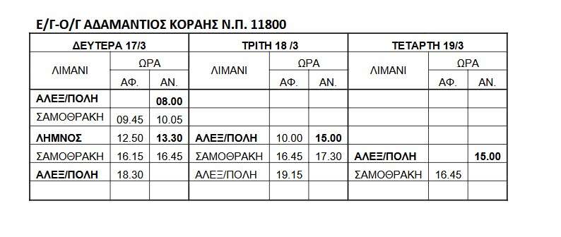 Η Fast Ferries ενημερώνει κατόπιν πρόβλεψης των μετεωρολογικών δελτίων, σύμφωνα με τα οποία για από απογευματινές ώρες Δευτέρας θα ισχύουν δυσμενείς καιρικές συνθήκες στις περιοχές πλόων του πλοίου μας Ε/Γ-Ο/Γ ΑΔΑΜΑΝΤΙΟΣ ΚΟΡΑΗΣ, τα δρομολόγια του πλοίου προκειμένου να διασφαλιστεί αφενός η ασφάλεια των πλόων και αφετέρου η όσο το δυνατόν καλύτερη εξυπηρέτηση των νησιών, για το διάστημα Δευτέρα 17/3 έως και Τετάρτη 19/3 θα διαμορφωθούν ως ακολούθως: