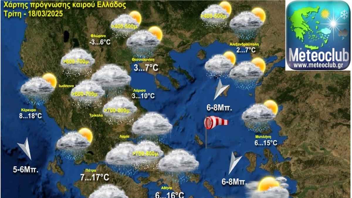 Αυξημένη συννεφιά αναμένεται στη βόρεια Ελλάδα από τις πρωινές ώρες. Χιόνια θα εκδηλωθούν στα ορεινά της δυτικής Μακεδονίας και σταδιακά τις πρωινές ώρες στα ορεινά της κεντρικής – ανατολικής Μακεδονίας και τα ορεινά – ημιορεινά της Θράκης και στα πεδινά τμήματα βροχές.   Τα φαινόμενα προς τις μεσημβρινές ώρες θα επεκταθούν νοτιότερα και θα επηρεάσουν τη Θεσσαλία , Σποράδες , Στερεά Ελλάδα / Εύβοια και την Πελοπόννησο με βροχές στα πεδινά , πιθανόν σποραδικές καταιγίδες σε κεντρική – ανατολική Στερεά Ελλάδα και Εύβοια για λίγη ώρα.  Χιόνια θα εκδηλωθούν στα ορεινά και αργότερα σε ημιορεινά της δυτικής – βόρειας και ανατολικής Θεσσαλίας , της κεντρικής Στερεάς Ελλάδας και από το απόγευμα στην ανατολική Στερεά Ελλάδα και τα ορεινά της Εύβοιας.