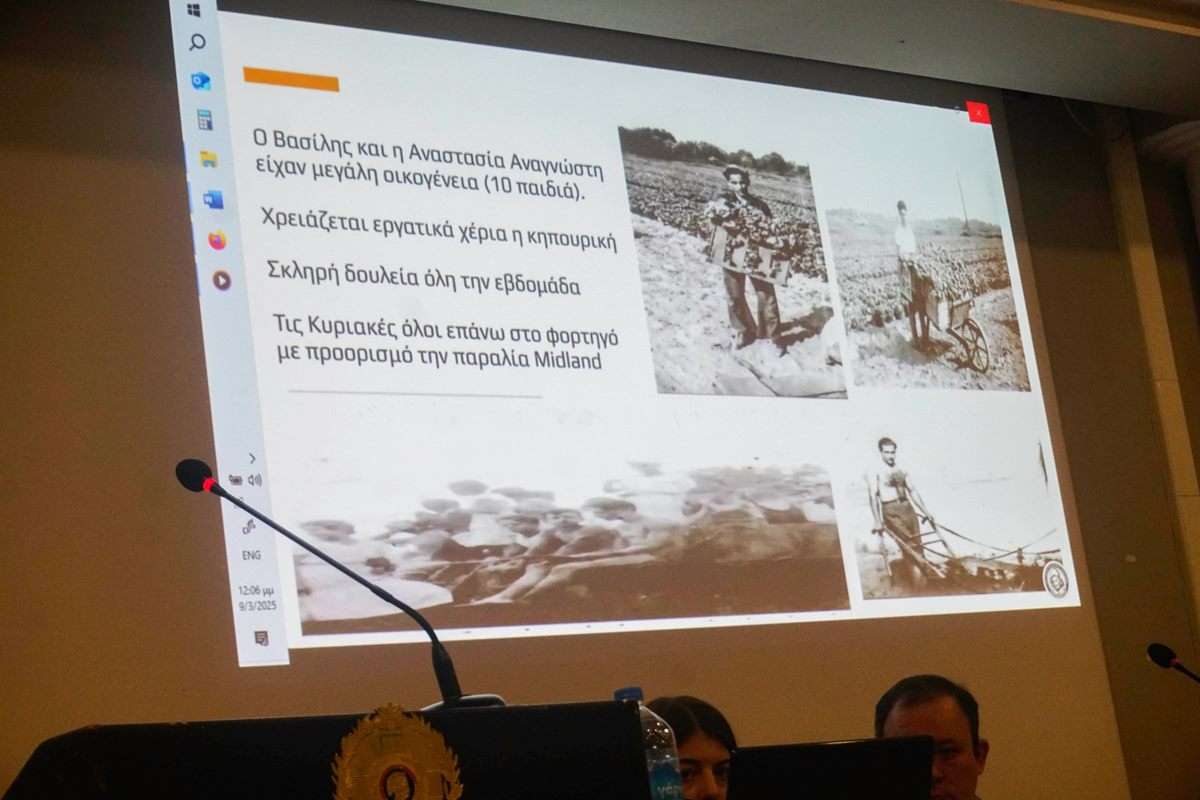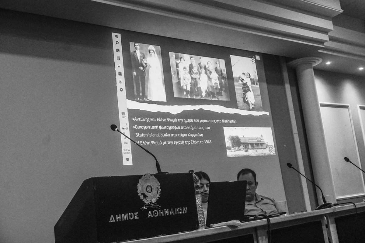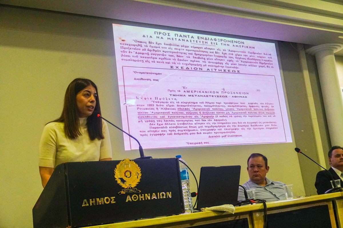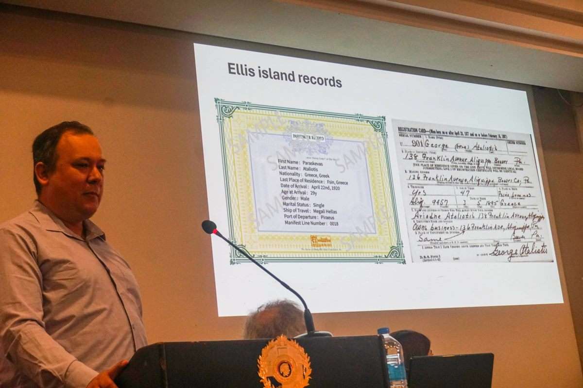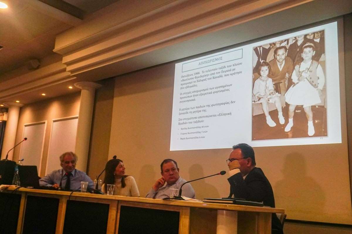 Η Τόνια Πραβλή στην ομιλία της παρουσίασε από το αρχείο του ταξιδιωτικού γραφείου της οικογενείας της ντοκουμέντα και αλληλογραφία σχετικά με την αναχώρηση Λημνιών μεταναστών με τα πλοία και τις διαδικασίες με τις αρχές .