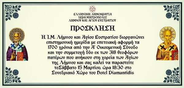 Η Ιερά Μητρόπολη Λήμνου και Αγίου Ευστρατίου διοργανώνει επιστημονική ημερίδα με αφορμή τη συμπλήρωση 1700 χρόνων από την Α’ Οικουμενική Σύνοδο, που πραγματοποιήθηκε στη Νίκαια το 325 μ.Χ.