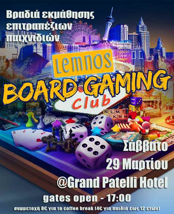 Το Lemnos Board Gaming Club σας προσκαλεί για ένα απόγευμα επιτραπέζιων παιχνιδιών, το Σάββατο 29 Μαρτίου από τις 17:00 μέχρι και μέχρι τα μεσάνυχτα, στον φιλόξενο χώρο του ξενοδοχείου Grand Patelli.