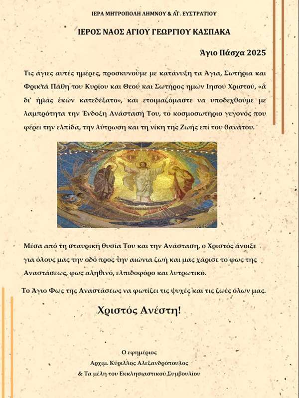 & Τα μέλη του Εκκλησιαστικού Συμβουλίου, απευθύνει με συγκίνηση το παρακάτω πασχαλινό μήνυμα, διατηρώντας αναλλοίωτο το νόημα της θυσίας και της Ανάστασης: