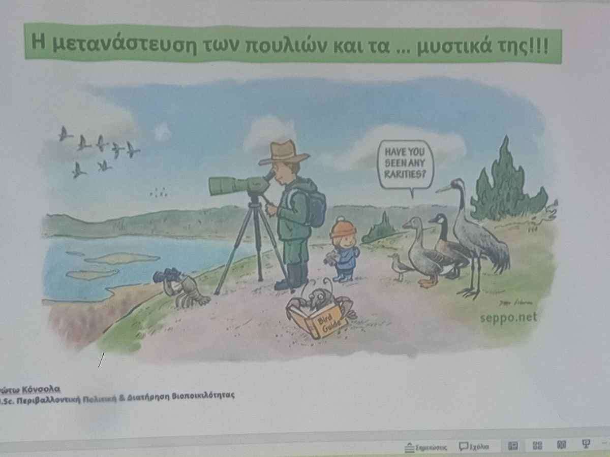 Η κα Φώτω Κόνσολα (M.Sc. Περιβαλλοντική Πολιτική &Διατήρηση Βιοποικιλότητας-Δασοπόνος)παρουσίασε στα παιδιά με μοναδικό τρόπο τη μετανάστευση των πουλιών και τα μυστικά της ,δίνοντας πληροφορίες γα τη μετακίνηση των πουλιών σε άλλη χώρα ή ήπειρο, την προετοιμασία τους γι αυτές τις μεγάλες μετακινήσεις ,καθώς και τους λόγους που αυτές γίνονται .Παρουσίασε επίσης τα είδη των πουλιών τα οποία συναντάμε στο νησί μας
