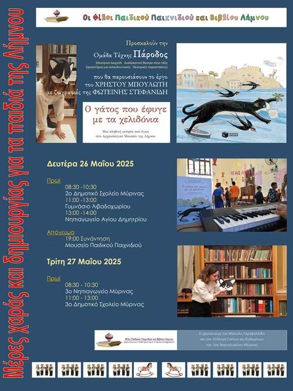 Οι Φίλοι Παιδικού Παιχνιδιού και Βιβλίου Λήμνου στα πλαίσια των εκπαιδευτικών -πολιτιστικών εκδηλώσεων τους, έχουν τη χαρά και την τιμή να προσκαλέσουν στο νησί μας την Ομάδα Τέχνης ΠΑΡΟΔΟΣ, η οποία επί πολλά χρόνια έχει αναπτύξει μια δυναμική και δημιουργική επικοινωνία με εκατοντάδες παιδιά και νέους επικεντρωμένη στο παιχνίδι, την κίνηση, τον χορό, τη μουσική και τη θεατρική έκφραση. Έχει πολυετή παρουσία στην ανάπτυξη θεατρικών παιχνιδιών με παιδιά και στην οργάνωση ποικίλων καλλιτεχνικών εκδηλώσεων και παραστάσεων για παιδιά,  βασισμένες κυρίως σε λογοτεχνικά κείμενα.