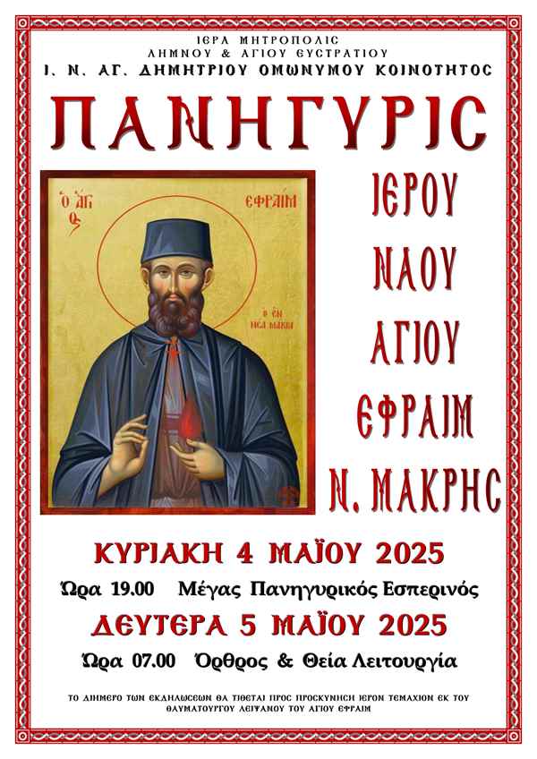 Με ιδιαίτερη λαμπρότητα και κατάνυξη θα τελεστεί και φέτος η πανήγυρη του Αγίου Εφραίμ στον Ιερό Ναό Αγίου Δημήτριου στο Αγιο Δημήτριο Λήμνου προσελκύοντας πλήθος πιστών από την ευρύτερη περιοχή και όχι μόνο.